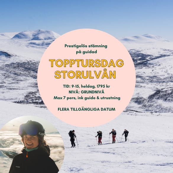 Vi älskar naturen kring Storulvån och tar gärna med dig på bra och trygg topptursåkning där. Vi lovar toppturstips, teknik, säkerhetstänk, trivsamt sällskap och en prestigelös stämning. Alla våra guider har minst lavin pro 1 utbildning, och är tjejer som brinner för att få andra tjejer (eller killar) att hänga mer på hela berget!